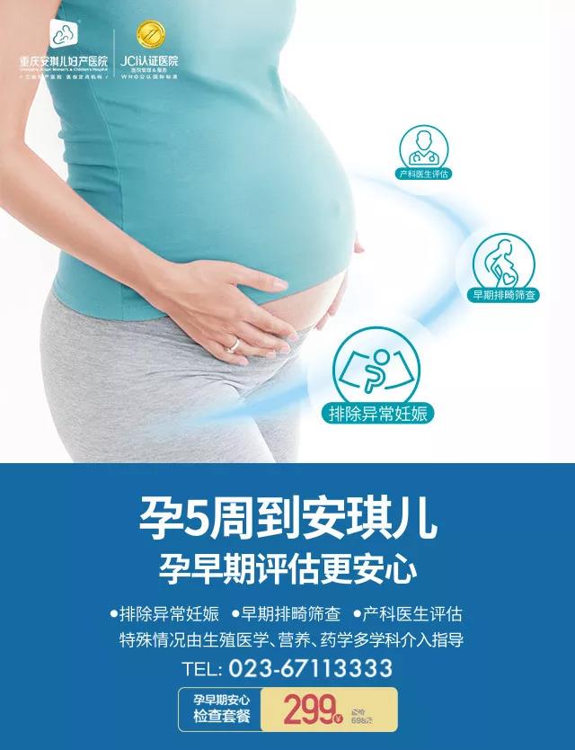 针对孕妈孕早期的各种担忧,重庆安琪儿妇产医院专门开设孕早期联合门诊,5-12周为孕妈进行孕早期全面评估,产科专家、营养师、药学专家、生殖医学专家等跨学科团队,能为刚怀孕的孕妈排忧解难。孕早期全面评估更安心,拨打023-67113333进行预约孕早期评估,299元孕早期安心检查套餐,助你稳稳度过孕早期。