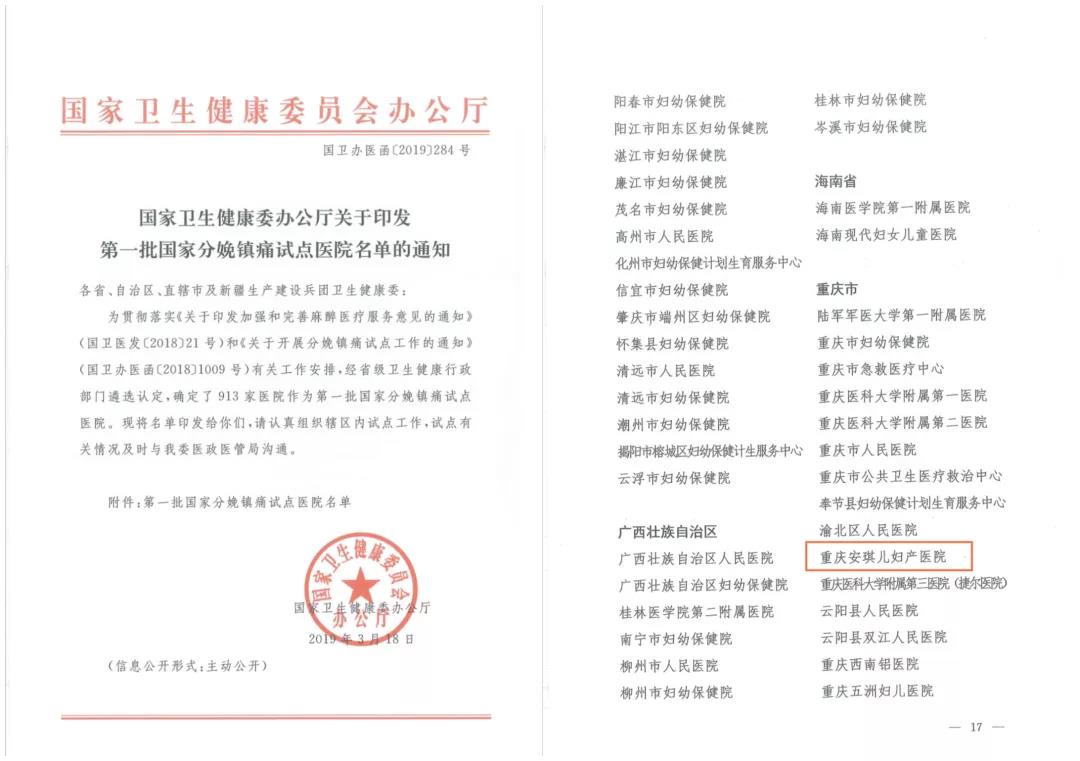 3月20日,国家卫健委公布了第一批国家分娩镇痛试点医院,重庆有41家医院上榜,其中既有陆军军医大学第一附属医院这样的三甲综合医院,也有重庆市妇幼保健院这样的专科三甲医院,同时也有重庆安琪儿妇产医院这样的民营高端妇产医院。