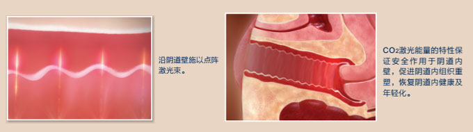 通过超脉冲二氧化碳点阵激光特有的探头,使二氧化碳激光直接作用于阴道壁上的黏膜组织,使再生黏膜恢复年轻时的状态,促进上皮细胞的自然更替,使阴道壁增厚,阴道紧致,激活女性自身修复能力并重新建立对病原微生物的酸性屏障。